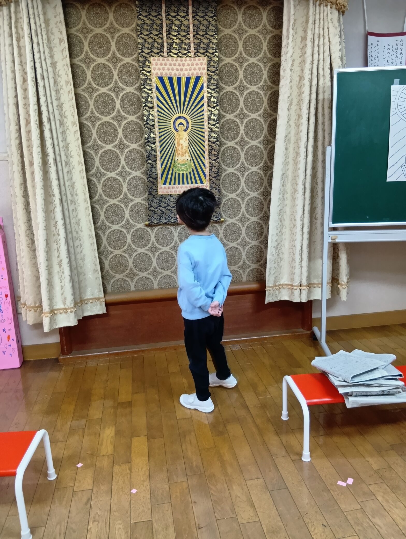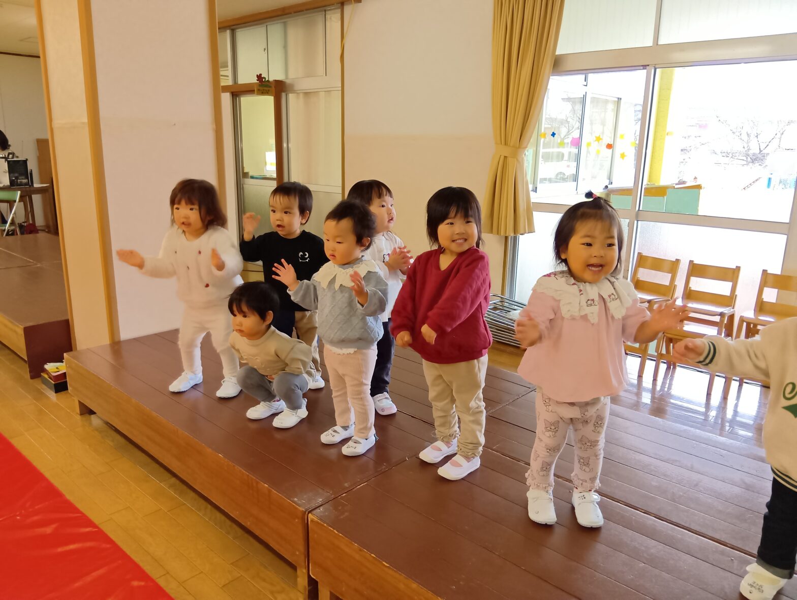 25.12.123・4・5歳児さんの 発表会の予行練習を見せてもらって たくさんのワクワクをもらった もも組の子どもたち💕 毎回と~っても楽しく見させてもらいました✨ お兄さん・お姉さん達の真似っこをして ステージに登ってみちゃおう❣ ステージの上…