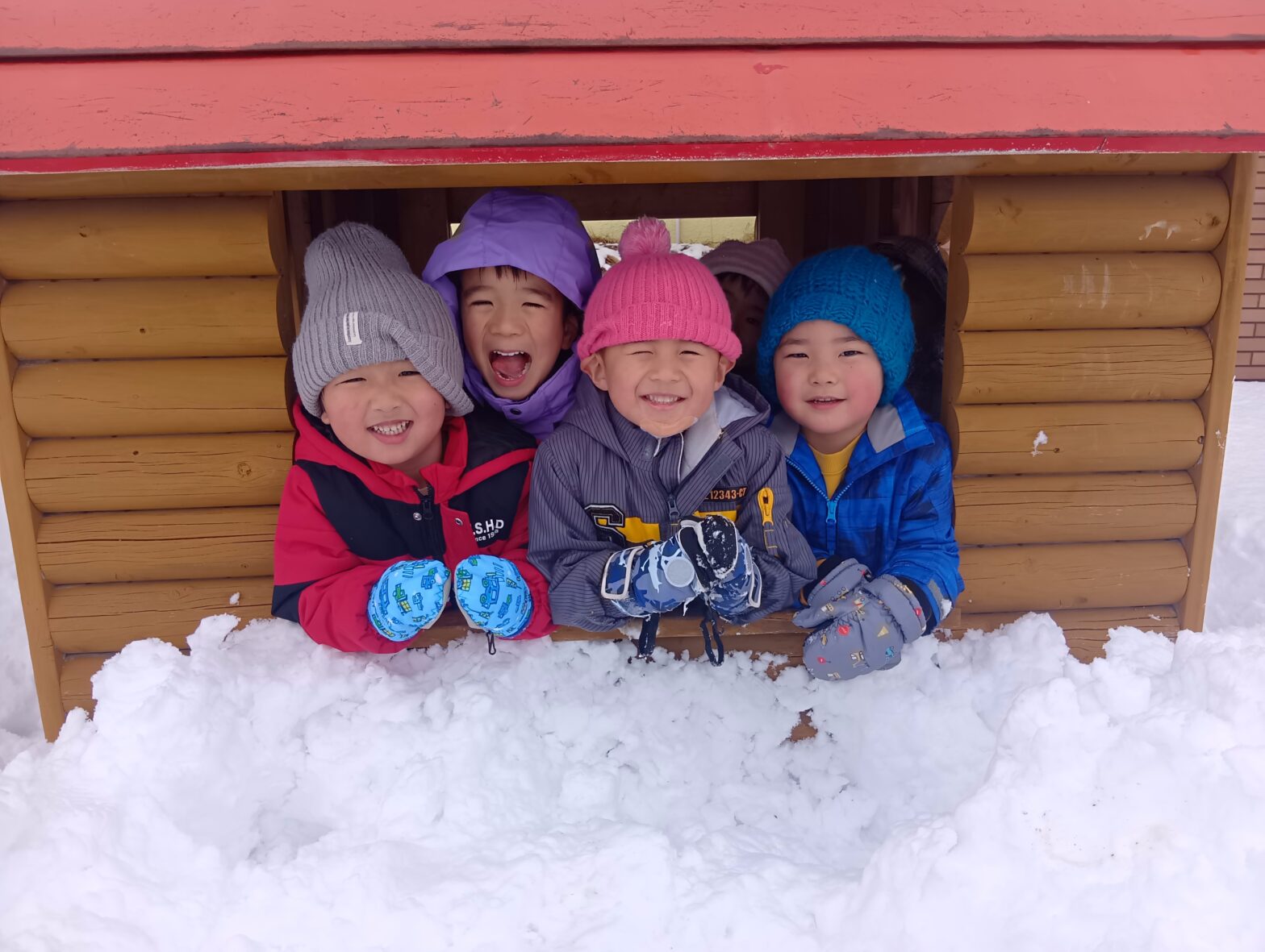26.01.22たくさん雪が積もりましたね⛄ フカフカの雪 気持ちよさそう~! 朝のおやつを食べて みんなでテラスへ! 雪いっぱ~~~い‼ 雪をギュッギュッと握って雪玉づくり 「おにぎり🍙」と言って 大事に持ってモグモグ食べる真似🥰 遊んでいると… うわぁ~~!…