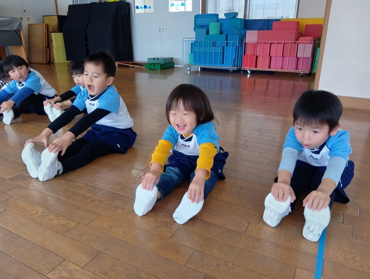 26.02.03初めての体操教室に参加しました! 和也先生と沙弥香先生の前で整列🫡ご挨拶🫡 「よろしくおねがいしますっ!!」 ♪サンサン体操に合わせて体ほぐし🌟 柔軟体操にも挑戦💫 みんな真剣です👀 思い切り走る! ウサ…
