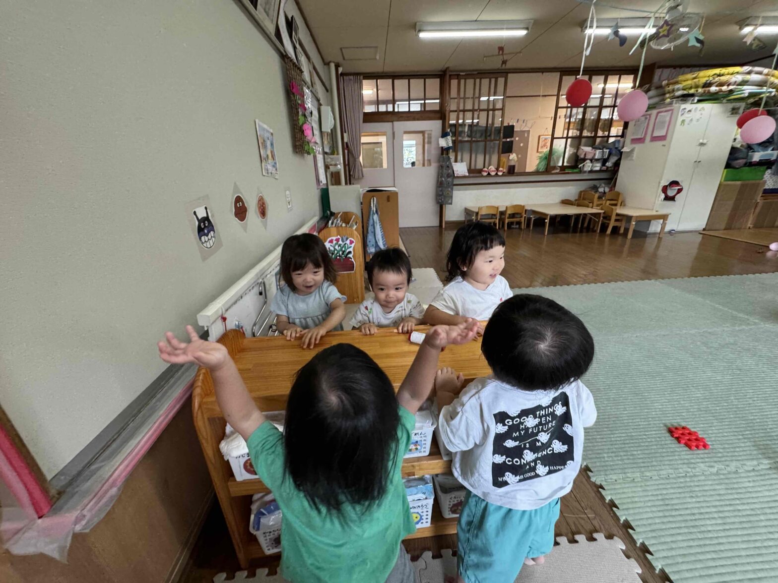 25.09.05いろいろな遊びの中で お友達と一緒に楽しむ姿が見られるようになった もも組の子供たち💕 絵本を一緒に見たり👀 オムツの棚越しで… いない いない ばぁ~‼ いい顔でしょ😍 こちらは 破れてしまったビニールプールの 底を…