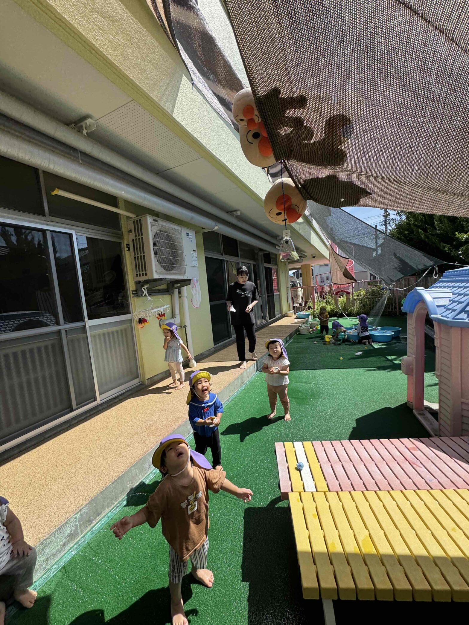 25.08.22毎日みんなの様子を見守ってくれている もも組のアンパンマンたち テラスを眺めて アンパンマンたちも水遊びしたいのかな? よ~し! アンパンマンたちも 水遊びに連れて行っちゃおう🎵 アンパンマンを泡でゴシゴシ~✨ お水の中でプカプカ~🐠 顔が濡れて…