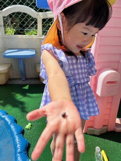 25.08.27暑い日が続いていて 水遊びが楽しい毎日! この日は、小さいお客様がやってきました。 「先生、これなぁに?」 『ダ・ン・ゴ・ム・シ だよ』 「ダンゴムシ!見せて〜見せて〜〜」 「うわぁ〜ちっちゃい♡」 「ダンゴムシさん こわくないよ」 「ねんねしてるのかなぁ」 …