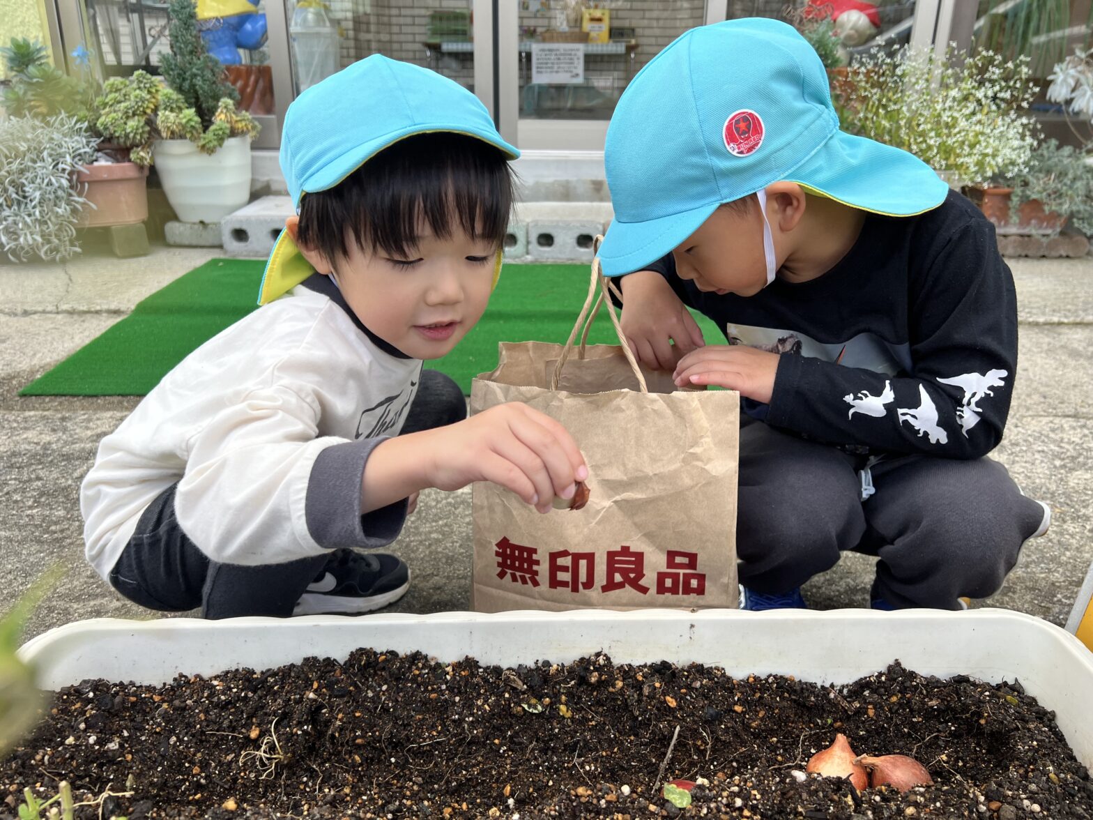25.10.30あやめ組さんに お仕事依頼が入りました✨ \チューリップの球根植えです🌷/ 全部で80個の球根を 色ごとにプランターに植えるのか ランダムにするのか聞いてみると …